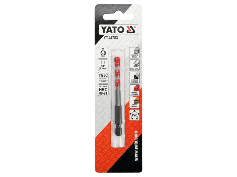 Universal drill from Yato YT-44783. Universal drill, which thanks to the special spiral design allows drilling in almost all materials - metal, concrete, aluminum, ceramics, wood and plastic. • Wolfram carbide blade of YG6X with a hardness of 89–91 HRC • Drill body with a hardness of 42–45 HRC • The spiral geometry accelerates the removal of spoil • efficient, durable and resistant to damage and racing • HEX 1/4ʺ hexagonal handle (6.3 mm) allows fastening for battery screws and stroke keys.
