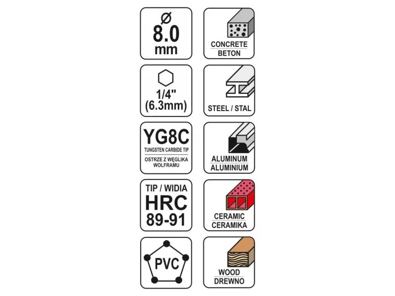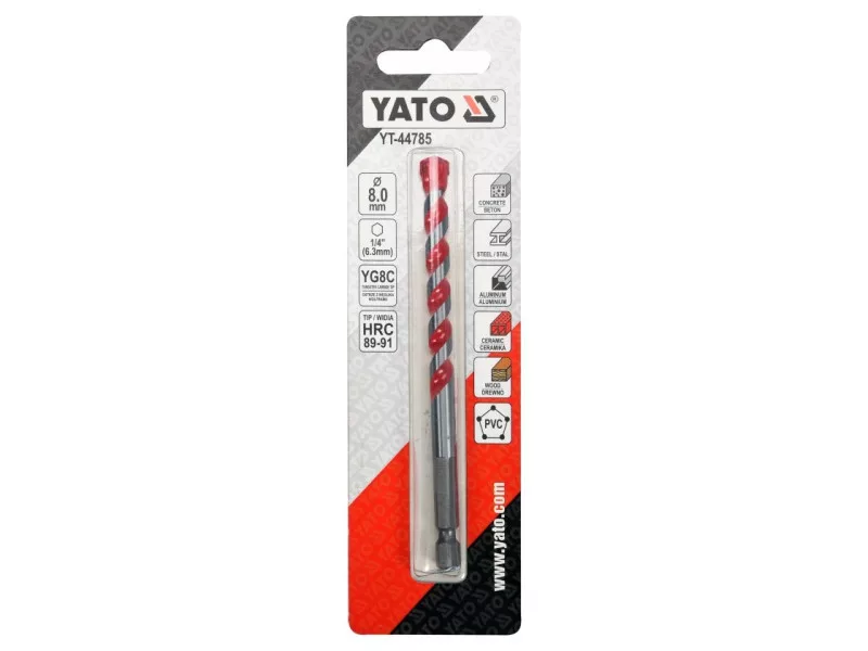 Universal drill from Yato YT-44785. Universal drill, which thanks to the special spiral design allows drilling in almost all materials - metal, concrete, aluminum, ceramics, wood and plastic. • Wolfram carbide blade of YG6X with a hardness of 89–91 HRC • Drill body with a hardness of 42–45 HRC • The spiral geometry accelerates the removal of spoil • efficient, durable and resistant to damage and racing • HEX 1/4ʺ hexagonal handle (6.3 mm) allows fastening for battery screws and stroke keys.