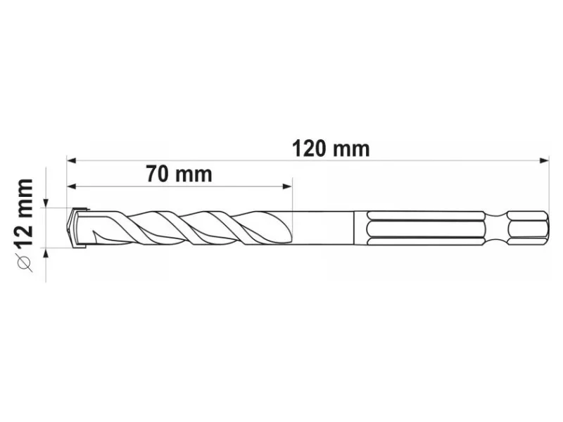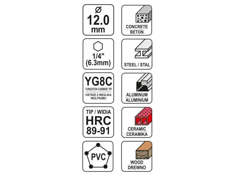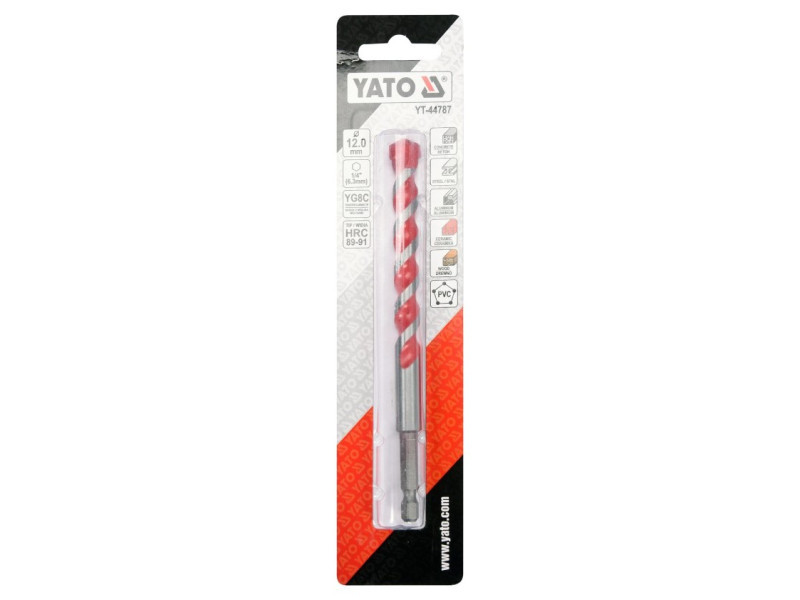 Universal drill from Yato YT-44787. Universal drill, which thanks to the special spiral design allows drilling in almost all materials - metal, concrete, aluminum, ceramics, wood and plastic. • Wolfram carbide blade of YG6X with a hardness of 89–91 HRC • Drill body with a hardness of 42–45 HRC • The spiral geometry accelerates the drainage of spoil • efficient, durable and resistant to damage and racing • HEX 1/4ʺ hexagonal handle (6.3 mm) allows fastening for battery screws and stroke keys.b