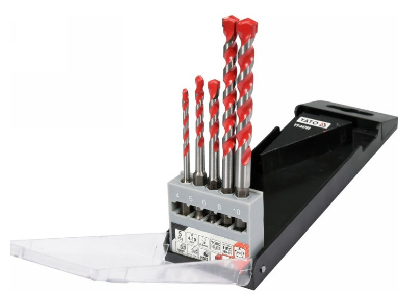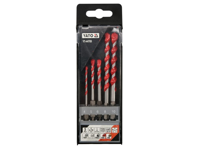 A set of universal drills from Yato YT-44789. Universal drills, which thanks to the special spiral design allow drilling in almost all materials - metal, concrete, aluminum, ceramics, wood and plastic. • Wolfram carbide blade of YG6X with a hardness of 89–91 HRC • Drill body with a hardness of 42–45 HRC • The spiral geometry accelerates the removal of spoil • efficient, durable and resistant to damage and racing • HEX 1/4ʺ hexagonal handle (6.3 mm) allows fastening for battery screws and stroke keys. Drills: 4, 5, 6, 8, 10mm