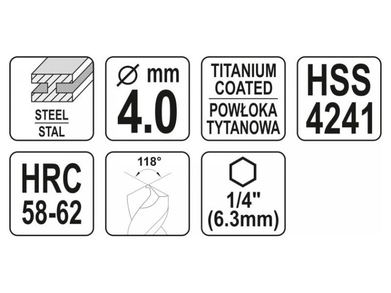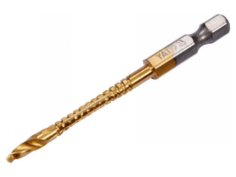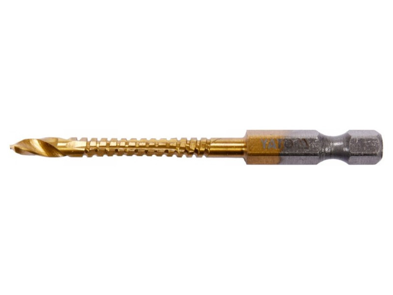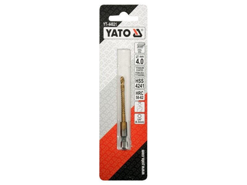 Metal milling drilling drill by Yato YT-44821. Milling drill made of high quality high -speed HSS 4241 titan -covered titanium. Intended for professional, industrial applications. STAL HSS provides several times faster drilling in stainless, acid -resistant and structural steel. The "Split Point" cross blade with an apical angle of 118 ° allows drilling without prior scoring, also with large diameters of drilling, guaranteeing perfect centering. They enable drilling in every direction and at any angle, perfect for drilling holes, including for door locks. The ground surface ensures excellent drilling precision. Made of one piece of steel, making them very strong and durable. Hard coating 58–62 HRC coated with titanium nitride maintains resistance to damage and stretching, maintaining the geometry of drilling • Lower drilling temperature and rapid heat dissipation do not cause melting galvanized and subsequent corrosion of drills • The smaller friction factor limits the adhesion to the chips and filings. 1/4 ″ hexagon handle (6.3 mm).