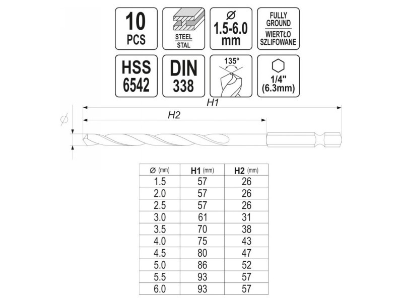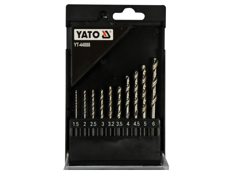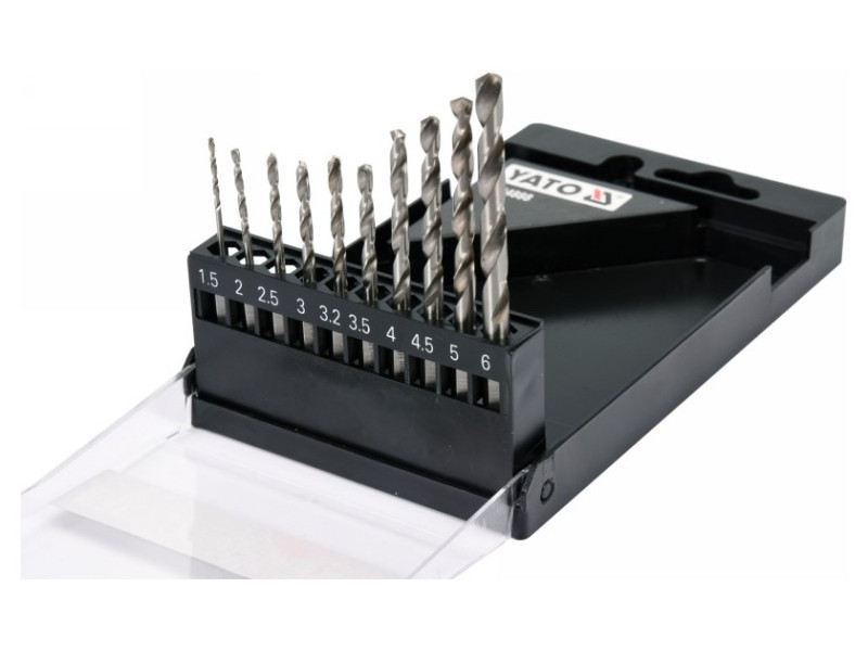 The set includes 10 HSS drill bits with diameters: 1.5, 2.0, 2.5, 3.0, 3.2, 3.5, 4.0, 4.5, 5.0, 6.0 mm, packed in a handy case