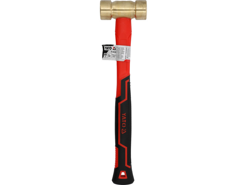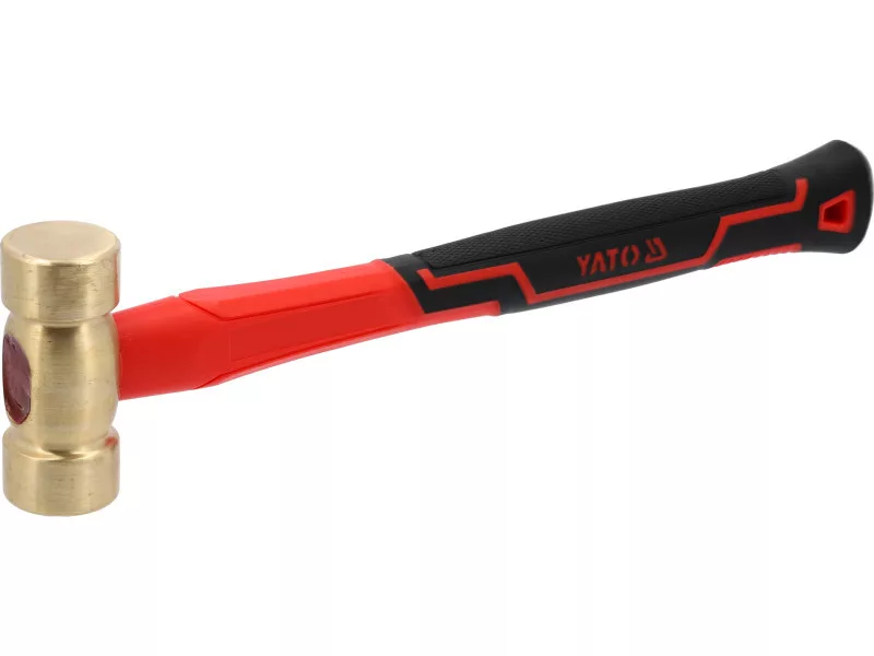Hammer with brass striker permanently mounted on a fiberglass handle. The high brass content and low hardness work perfectly, without damaging the surface of the worked object.
