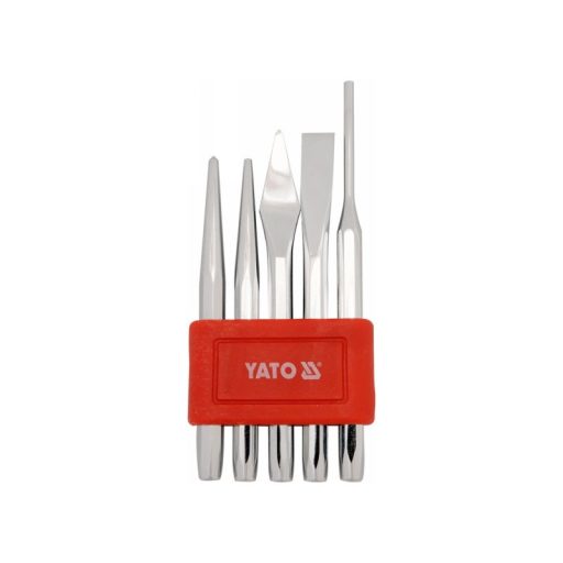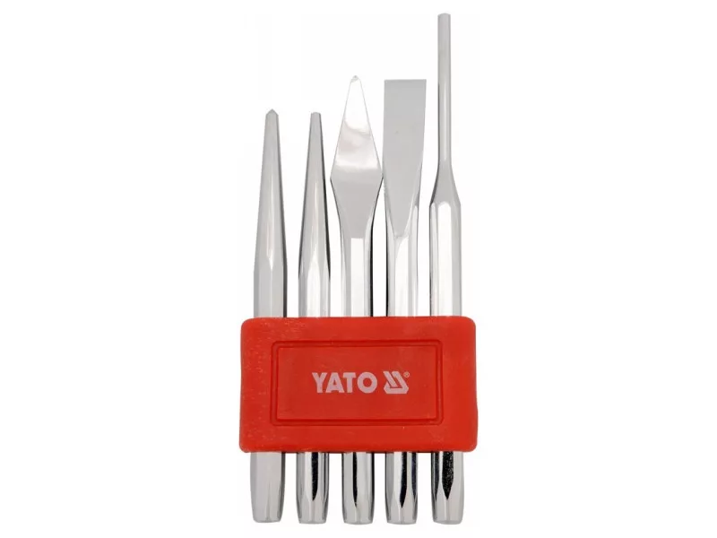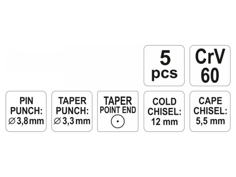 Set includesflat cutter (12x130 mm), cross cutter (5.5x130 mm), parallel punch (Ø3.8x150 mm), conical tapping block (Ø3.3x120 mm), center punch (Ø3.8x120 mm)