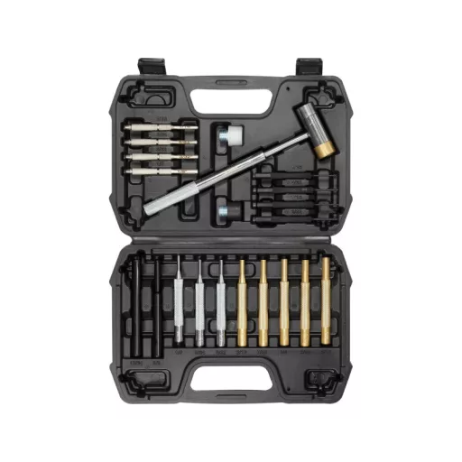 Drift set for precision mechanics' workshops, watchmakers and jewellers. Beater with interchangeable screw-in tips - steel, brass, nylon, rubber. Set packaged in a plastic case.