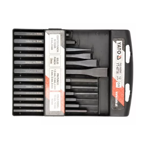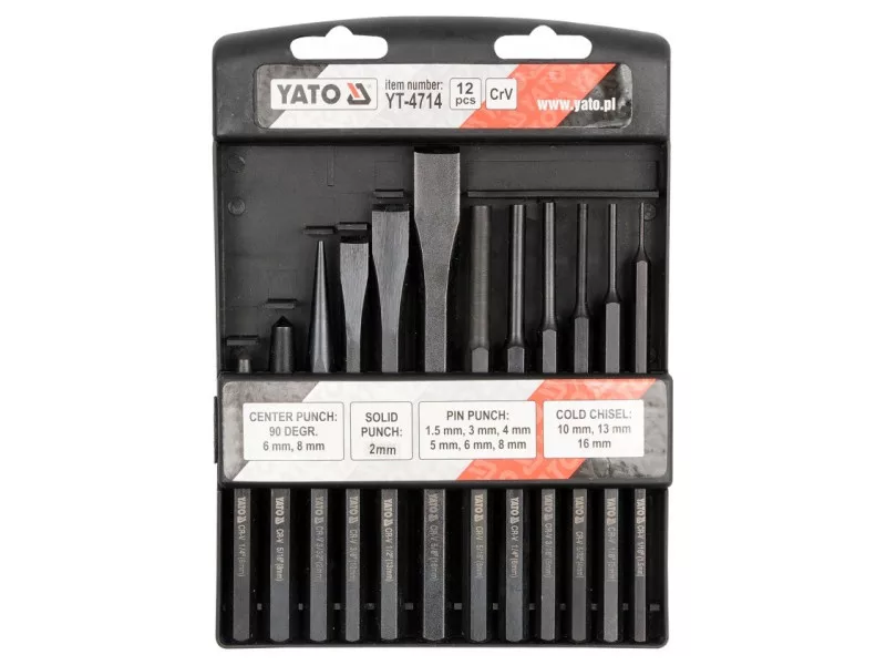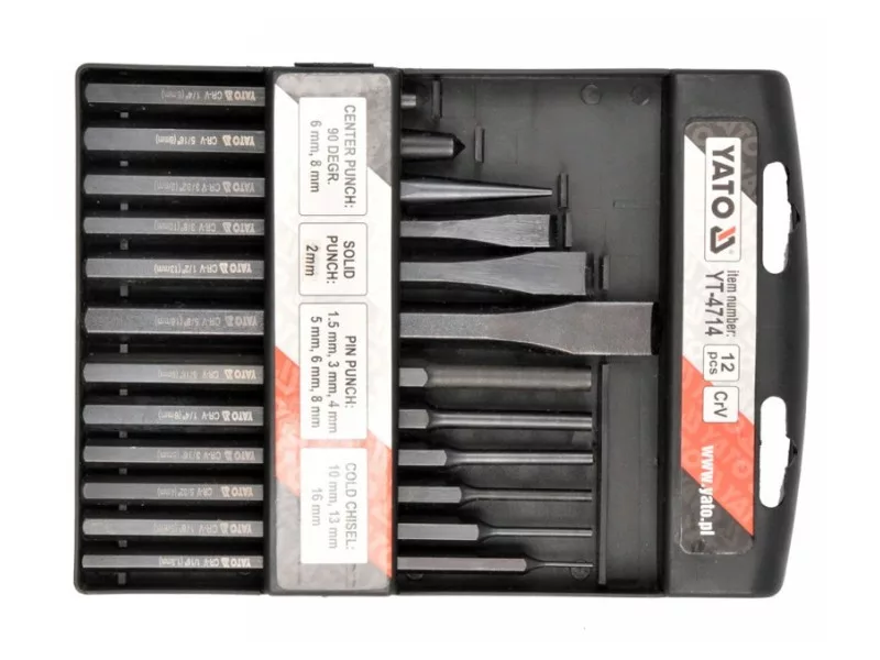 | Set includes | flat cutter x3 (10x142 mm, 12x152 mm, 16x172 mm), parallel punch x6 (Ø1.5x152 mm, Ø3x152 mm, Ø4x152 mm, Ø5x152 mm, Ø6x152 mm, Ø8x152 mm), conical tapping block (Ø2x140 mm), |