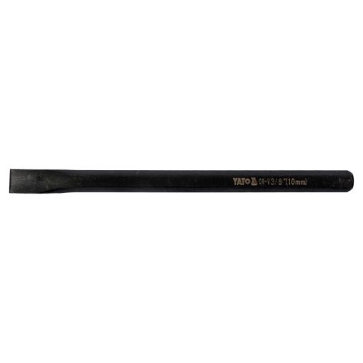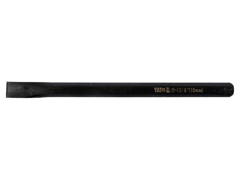 Flattened working part with sharpened, milled edge , the chisel leaves a mark on the material when struck with a hammer, overall length 142 mm, width 10 mm, handle with 9.4 mm hexagonal profile. Made of CrV6150 steel fully blackened. Locksmith chisel for metal work, chiselling, notching, marking, cutting off bolts or rivets and other similar applications.