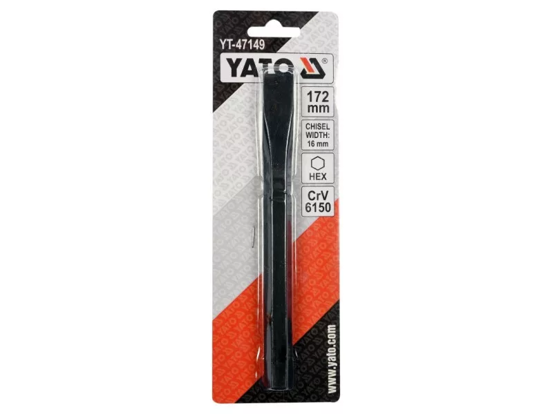 Flattened working part with sharpened, milled edge , the chisel leaves a mark on the material when struck with a hammer, overall length 172 mm, width 16 mm, handle with 9.4 mm hexagonal profile. Made of CrV6150 steel, fully blackened. Locksmith chisel for metal work, chiselling, notching, marking, cutting off bolts or rivets and other similar applications.