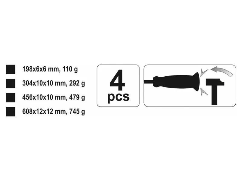 Set includescrowbar x4 (198x6x6 mm, 304x10x10 mm, 456x10x10 mm, 608x12x12 mm)