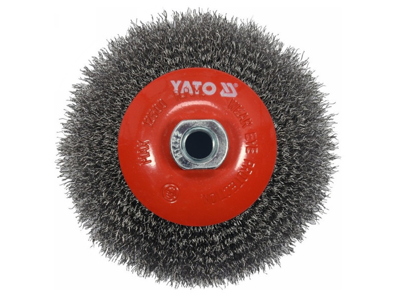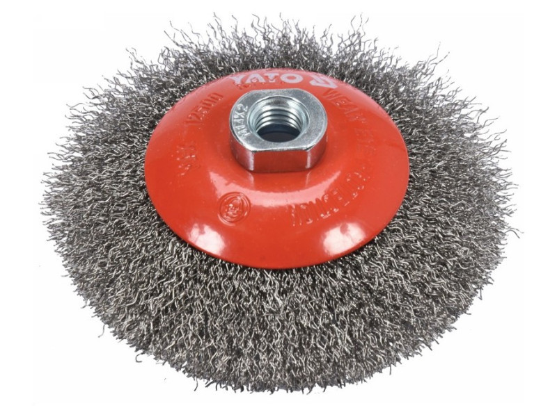 Rotary brush designed for cleaning and polishing metal surfaces, paint coatings, as well as rust removal and tool cleaning, using a grinder.