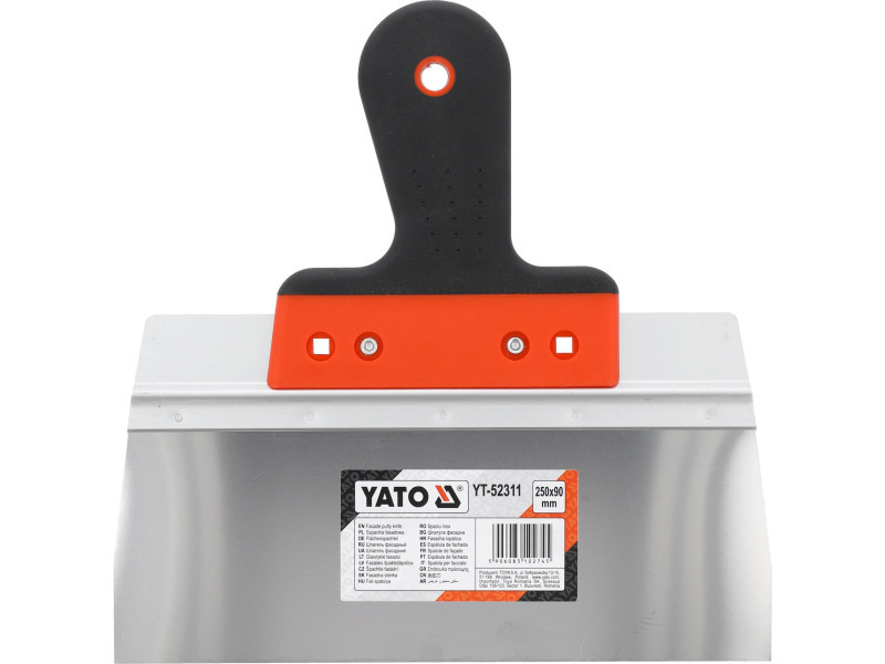 Facade putty is used for all kinds of plastering and finishing works for leveling and collecting gypsum mass. Made of high quality stainless steel are corrosion resistant. Their wide blade with optimal elasticity guarantees precise finishing of the surface of the walls or ceilings. Equipped with an ergonomic two -component handle minimizing the risk of abrasions. & Nbsp; The handle is comfortable in the hand regardless of whether it is used with the right or left hand. & Nbsp; & nbsp; & nbsp; The putty blade is made of stainless steel additionally reinforced with a multi -point fastening of the profile to obtain the perfect tool stiffening. & Nbsp; It is durable, stable and stiff in a natural way, the effect of a smoothly enlisted surface is achieved. Additional reinforcement with multi -point fastening over the length of the profile. & Nbsp; A convenient two-component handle attached with two rivets, a blade permanently installed in the aluminum profile, special holes allow the installation of an articulated handle for the extension: YT-52317 & nbsp; Axial spacing of mounting holes-93mm Flexible blade made of stainless steel working width-250mm Total height-250mm blade height-90mm thick sheet thick Aluminum profile thick-25 WAGA-250G