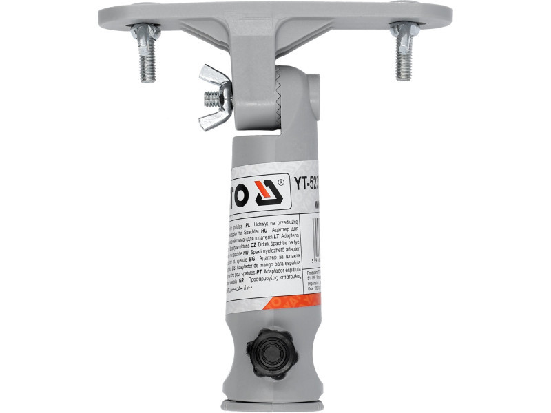 Universal toggle mount, when screwed to the spatula, allows the installation of an extension or shaft. The tip, equipped with a special insert, is compatible with sticks ending in a truncated cone, thread and some snaps. The serrated joint allows any but rigid angle adjustment.