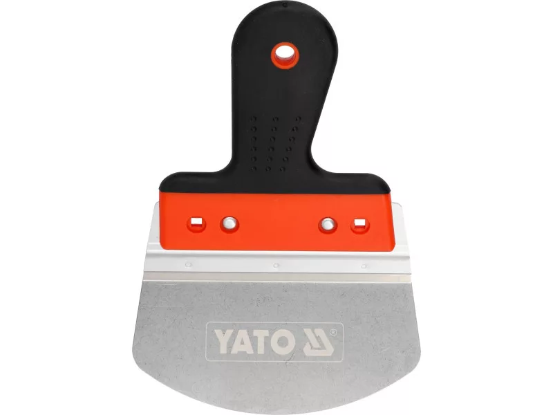 High quality flexible profiled spatula for picking compounds and resins from rounded containers - buckets, pails and trays. Comfortable two-component handle attached with two rivets. The blade made of durable and flexible stainless steel. Special holes allow mounting the articulating handle to the extension YT-52317.