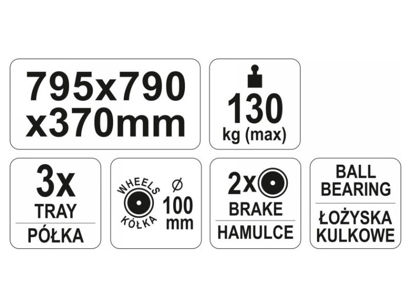 Three -level workshop stroller. Load capacity 130 kg. Practical, three -level workshop trolley with a load capacity of 130 kg. Thanks to it, you can always have the tools you need at hand. • load capacity: 130 kg • 3 comfortable shelves • durable, made of steel • has 4 wheels, including 2 torsional with a brake, the package contains a three -level workshop stroller.