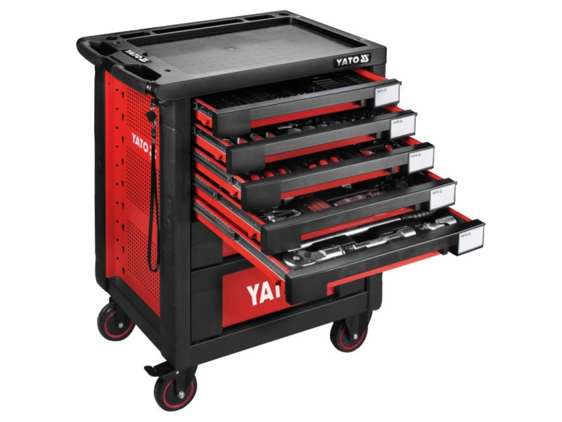 YATO brand tool cabinet. It is equipped with 7 drawers on ball bearing slides. 5 górne drawers contain 165 carefully selected tools. Profiles are made of underwater steel sheet - universal perforation allows retrofitting the cabinet with additional items. Central locking and individual locking of each drawer.
