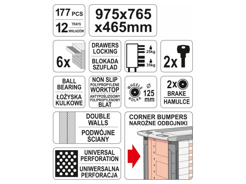 Profiles are made of double sheet steel. The workshop cabinet has corner bumpers that protect against accidental damage, such as to the car body. Strengths also include a non-slip work surface, rubber wheels 125 mm, including 2 with a brake, universal wall perforation, double walls.