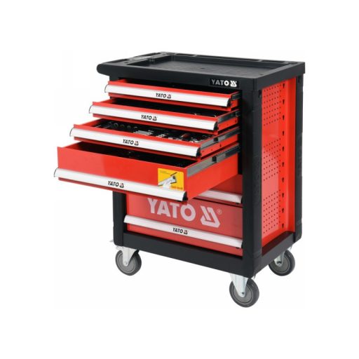YATO tool service cabinet. It has 6 drawers with a locking mechanism, that mounted on ball bearing slides - 3 upper drawers have a load capacity of 25 kg, and 3 lower drawers have a load capacity of 35 kg. The cabinet has been equipped with handy handle and durable, rubber wheels, so moving it is not a problem at all.