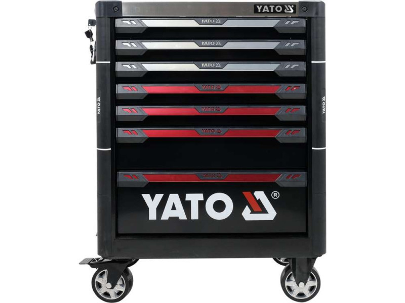 The new service cabinet with tools YT-55308 is a unique construction with a mechanism that prevents opening more than one drawer at a time.