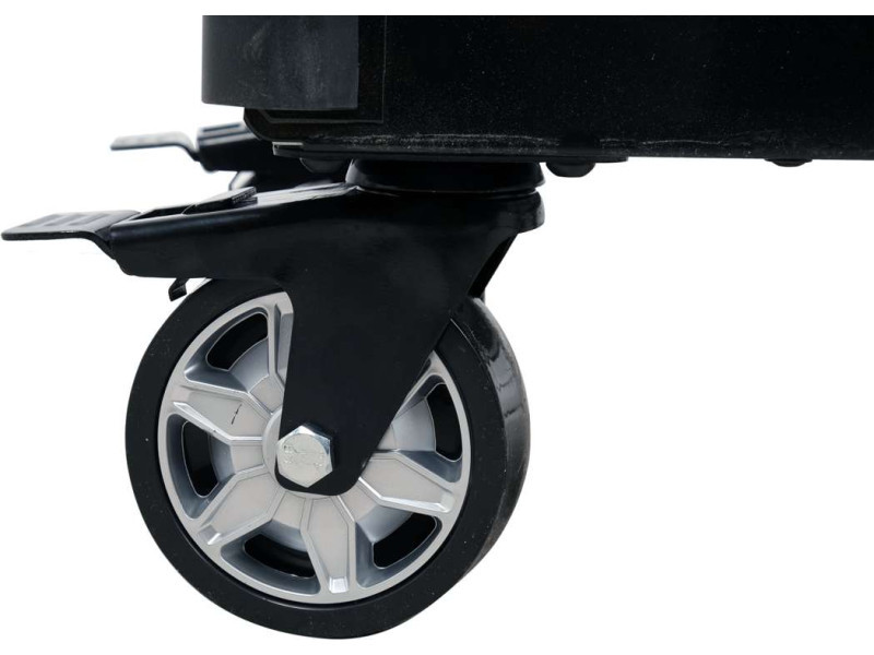 The stable construction rests on four wheels, two of which are swivel and equipped with brakes.