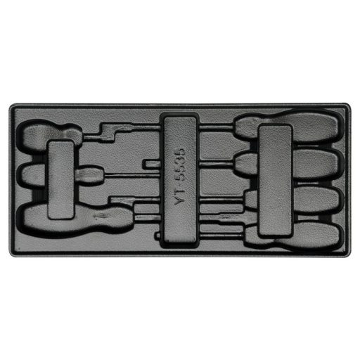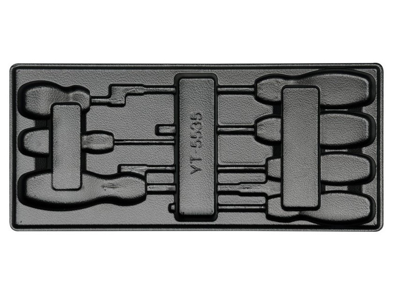 Empty drawer insert designed for 7 screwdrivers, such as Yato flathead screwdrivers in sizes: 3x75 mm, 5x100 mm, 5x150 mm, 6x38 mm, 6x100 mm, 6x150 mm, 8x150 mm.