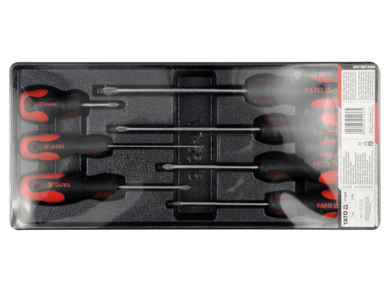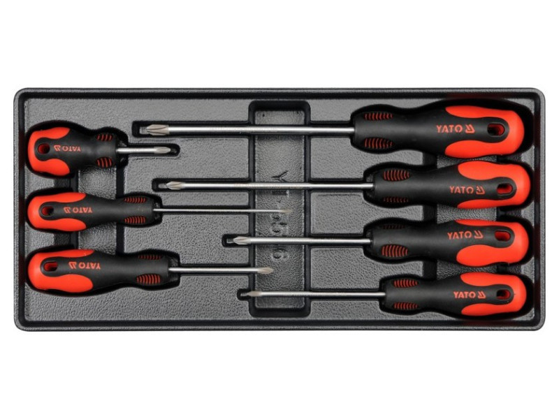 Drawer insert containing a set of 7 Phillips screwdrivers: PH0x100 mm, PH1x75 mm, PH1x100 mm, PH2x38 mm, PH2x100 mm, PH2x150 mm, PH3x150 mm