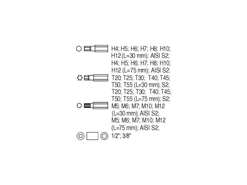 - Spline screwdriver tip: M5, M6, M8, M10, M12 (L=30 mm); M5, M6, M8, M10, M12 (L=75 mm)