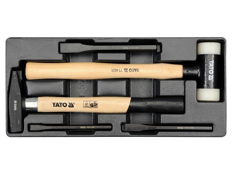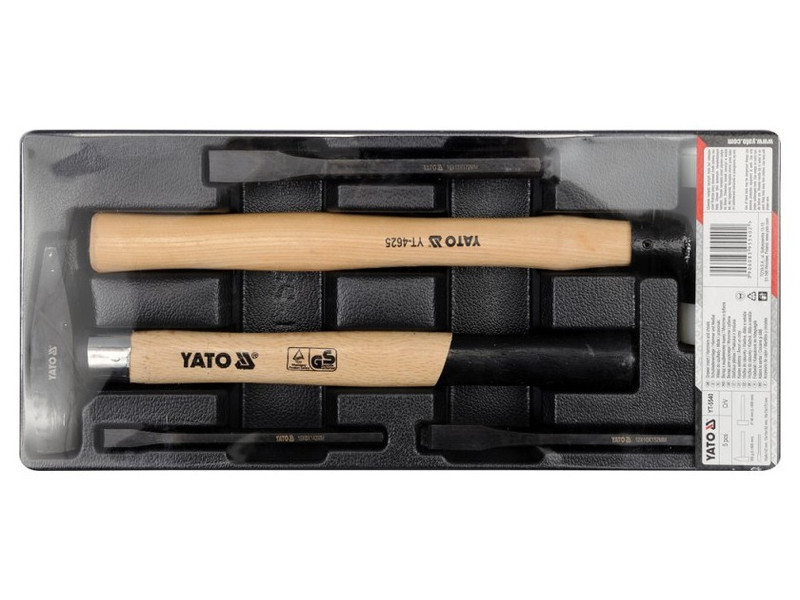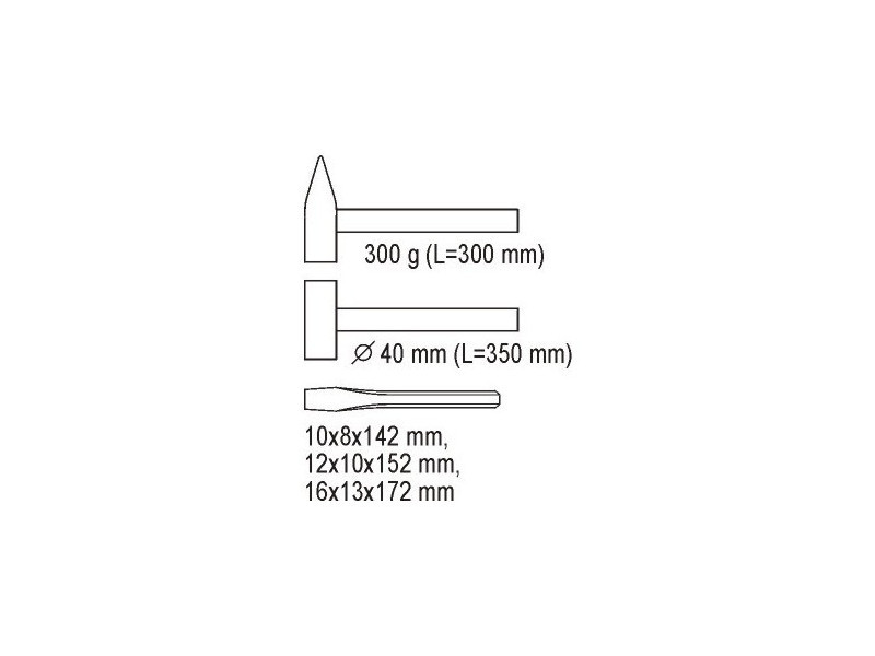 | Set includes | stonemason's hammer (300 g, 300 mm), recoilless hammer (Ø40 mm, 350 mm), flat cutter x3 (10x142 mm, 12x152 mm, 16x172 mm) |