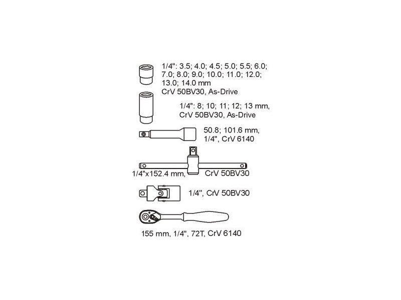 • 1/4" sockets: 3.5, 4, 4.5, 5, 5.5, 6, 7, 8, 9, 10, 11, 12, 13, 14 mm