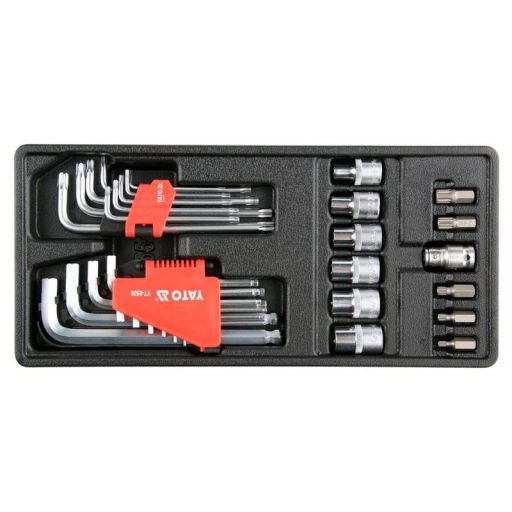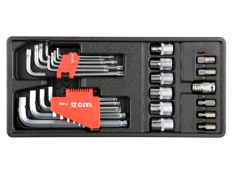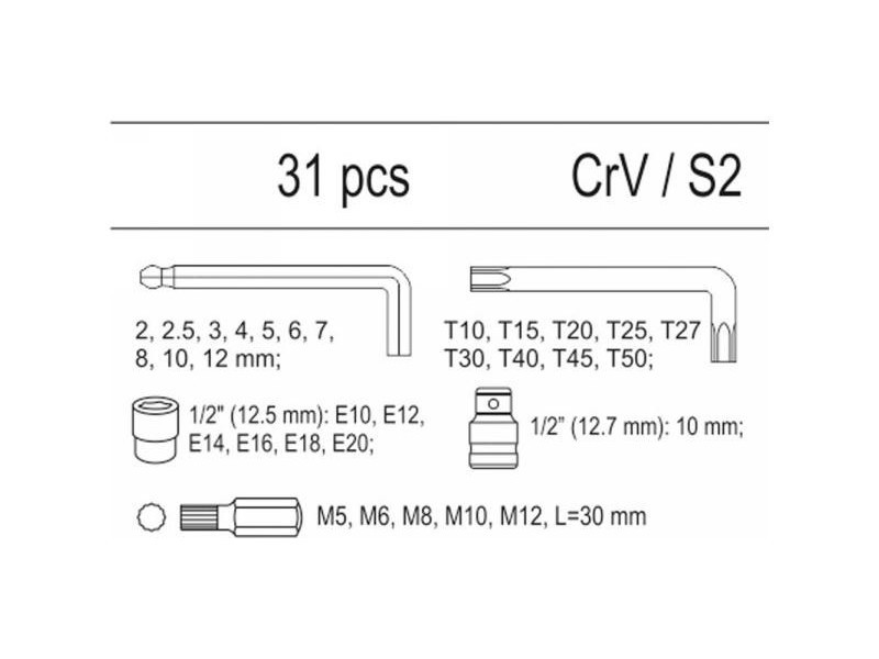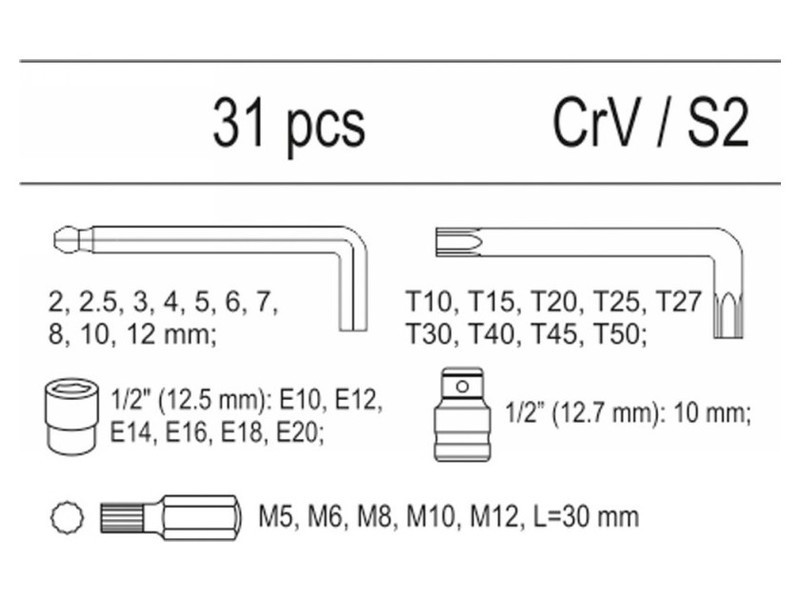 Drawer insert containing 31 elements. The set includes Allen keys with a ball, Torx Allen keys, attachments and bits. - insert - Allen key HEX ended with a varnish - from 2 mm to 12 mm - Allen key TORX T10 T15 T20 T25 T27 T27 T45 T45 T50 - Torx 1/2 "E10, E12, E14, E16, E18, E20 - SPLine screwdriver M5, M6, M8, M10, M12 - 1/2 "attachment