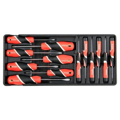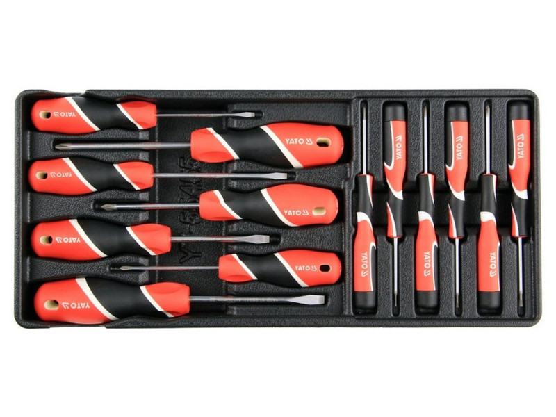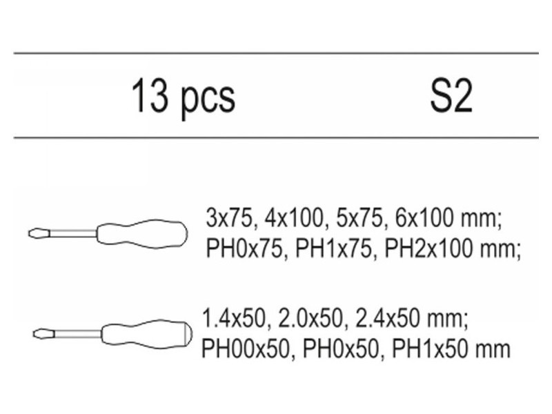 Drawer cartridge containing a set of 13 screwdrivers. - insert - screwdrivers 3x75, 5x75, 4x100, 6x100 - screwdrivers PH0x75, PH1X75, PH2x100 mm - screwdrivers 1.4x50, 2.0x50, 2.4x50 - screwdrivers PH00X50, PH0x50, PH1x50 mm