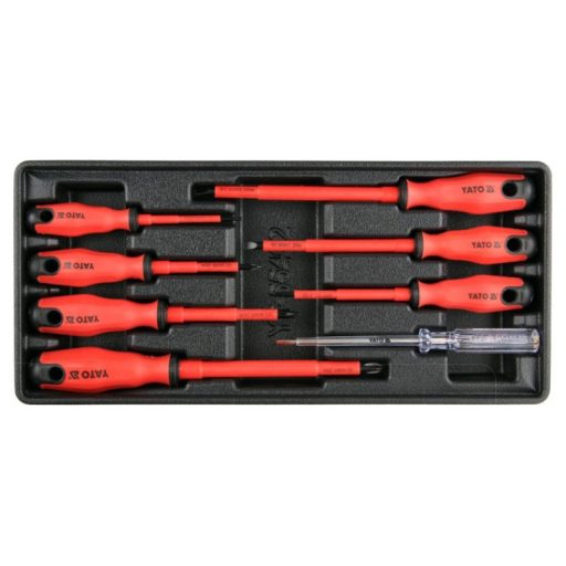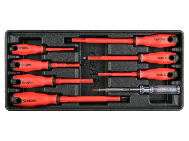 Drawer insert containing insulated screwdrivers. - insert - insulated screwdrivers 3x75, 4x100, 5.5x125, 6.5x150 1000V - isolated screwdrivers PH1x80, PH2x100, PH3x150mm 1000V - electric sampler 4x190mm 250V