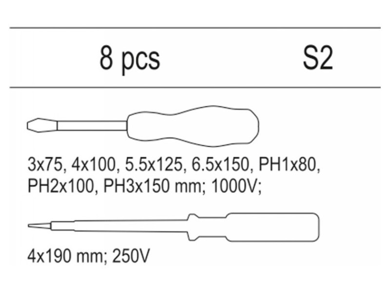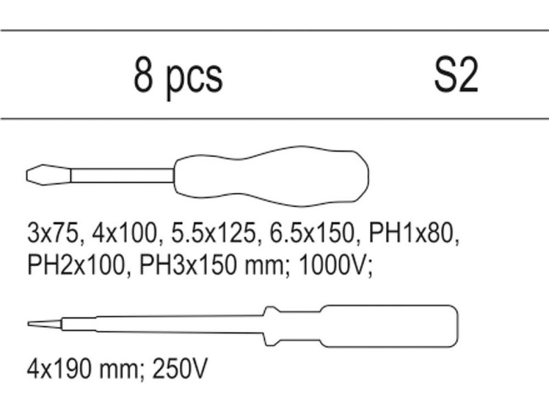 | Set includes | insulated screwdriver x7 (flat: 2.5x75 mm, 4x100 mm, 5.5x125 mm, 6.5x150 mm; Phillips (PH): PH1x80 mm, PH2x100 mm, PH3x150 mm), voltage tester (4x190 mm, 250V) |