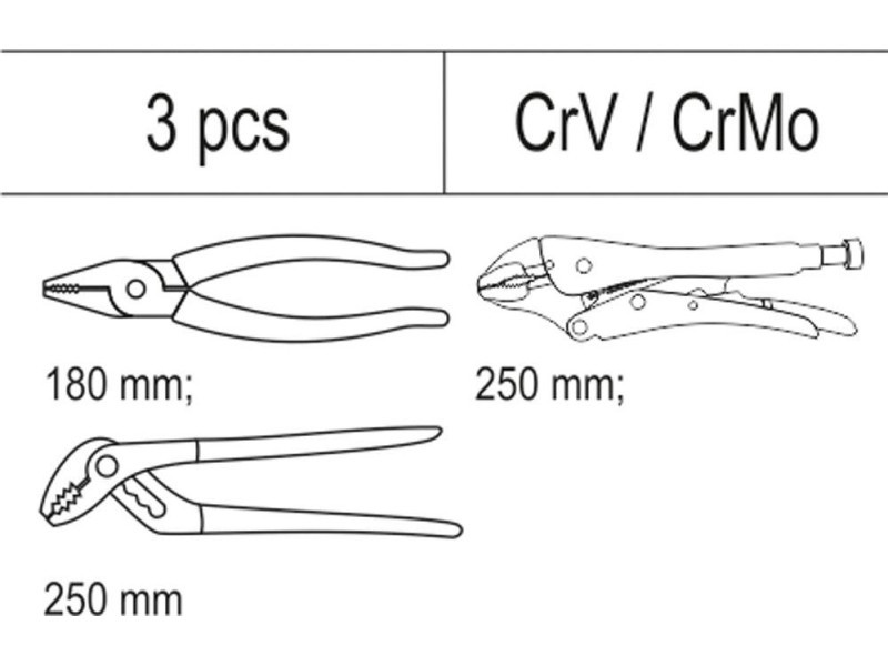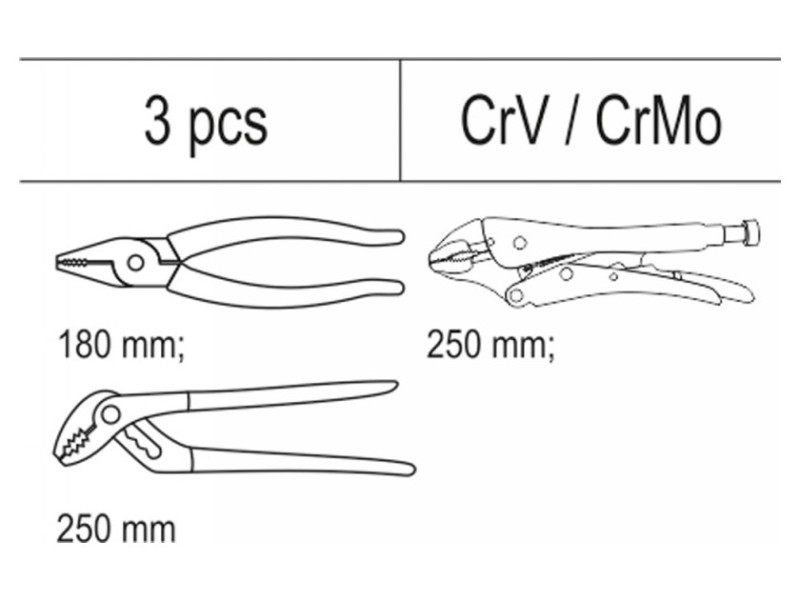 | Set includes | combination pliers (180 mm), adjustable pliers (10" / 250 mm), locking pliers (10" / 250 mm)More |