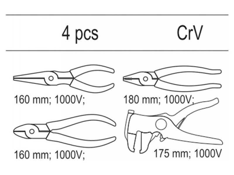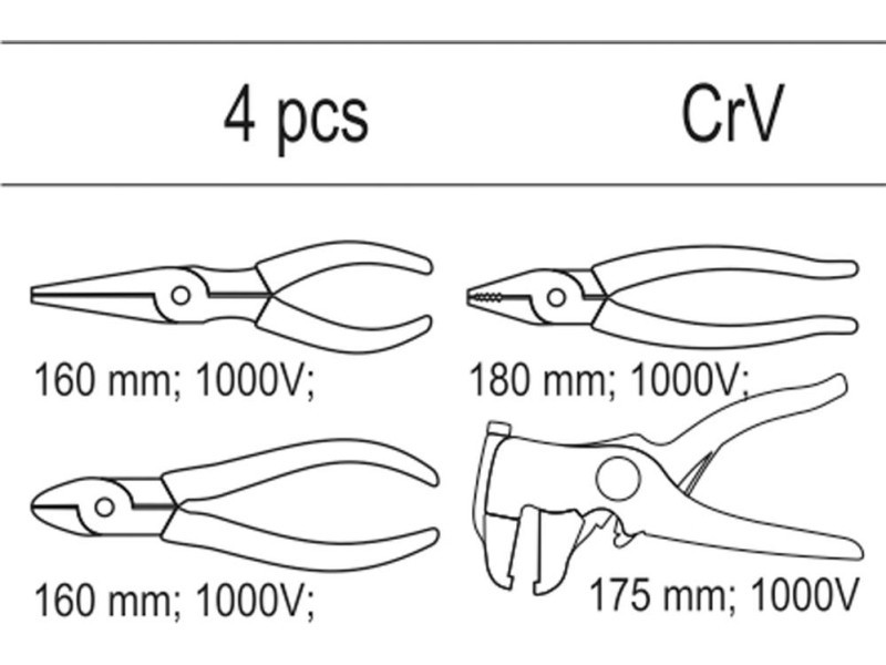 | Set includes | insulated combination pliers (180 mm), insulated side cutting pliers (160 mm), extended straight insulated pliers (160 mm), automatic insulation stripper (175 mm) |