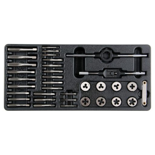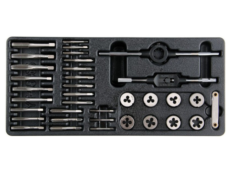Drawer insert containing a 35-element Narzynek set and threaders. - insert - 3xm3x0.5, 3xm4x0.7, 3xm5x0.8, 3xm6x1.0, 3xm7x1.0, 3xmm8x1.25, 3xmm10x1.5 .0, M7x1.0, M8x1.25, M10x1.5, M12x1.75 - pokrętło do narzynek - pokrętło do gwintowników - szczelinomierz 0.5-1.75 mm