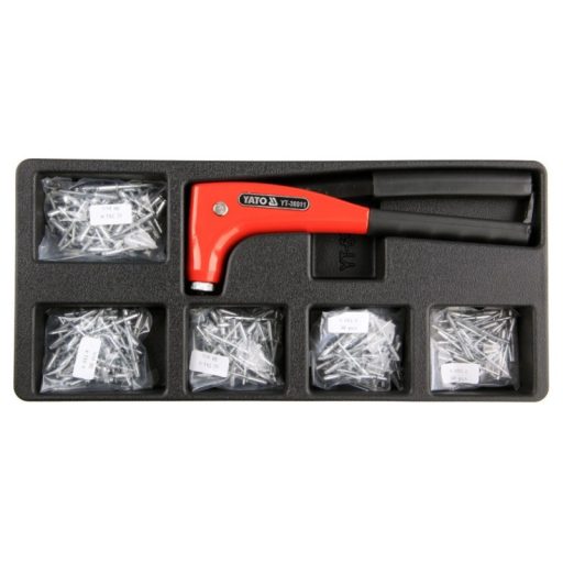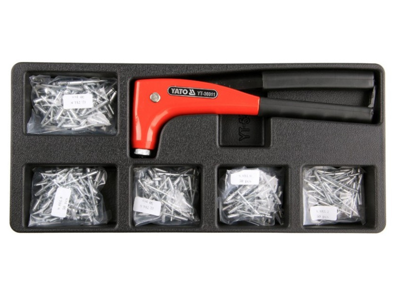 Drawer cartridge containing a hand -haired riveter with a rotary head and rivet sets. - insert - hand rhive rivet with the YT -36011 rotary head - discontinuous rivets 6.6x3.2 - teeth rivet 9.6x4.0 - teething rivet 12.7x4.0 - Rubbing rivets 9.6x4.8 - Retrial rivet 12.7x4.8