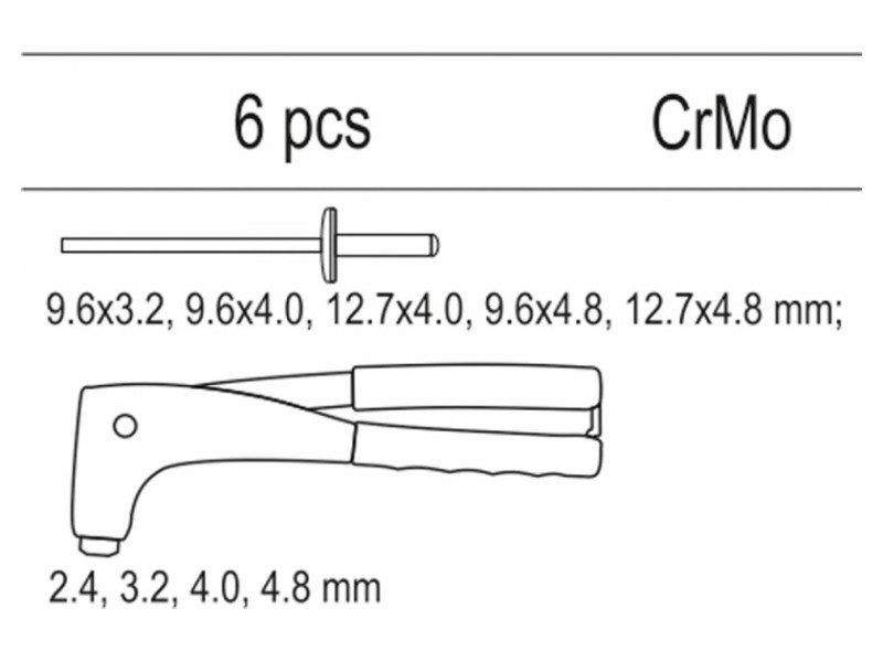 | Set includes | hand riveter (Ø2.4 mm, Ø3.2 mm, Ø4 mm, Ø4.8 mm), aluminum rivets x250 (x50: Ø3.2 mm x 9.6 mm, x50: Ø4 mm x 9.6 mm, x50: Ø4 mm x 12.7 mm, x50: Ø4.8 mm x 9.6 mm, x50: Ø4.8 mm x 12.7 mm) |