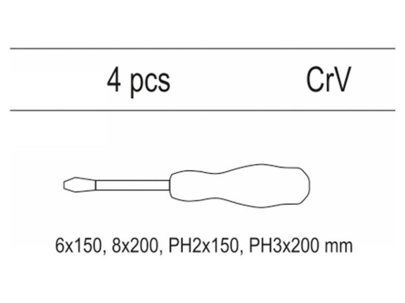 | Set includes | punching screwdriver x4 (flat: 6x150 mm, 8x200 mm; Phillips (PH): PH2x150 mm, PH3x200 mm) |
