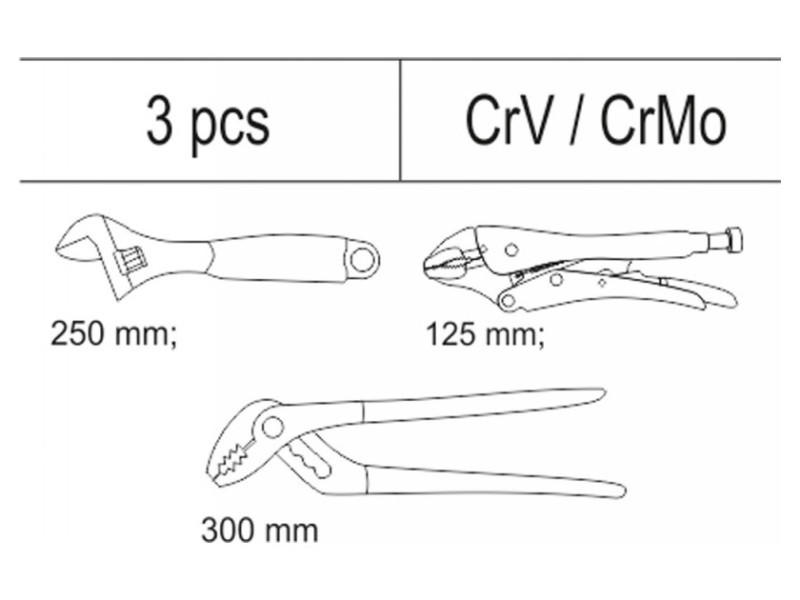 | Set includes | adjustable wrench (250 mm), locking pliers (5" / 125 mm), adjustable pliers (12" / 300 mm)More |