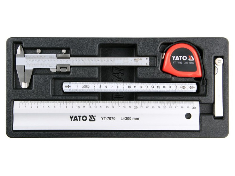 Drawer insert containing a set of measuring tools. - insert - aluminum fitting YT -7070 length 300 mm - bumps of YT -7200 length 150 mm - cut -out measure YT -71130 3 m x 16 mm - slit meter YT -7220 0.02 mm to 1 mm - 2 m assembly measure