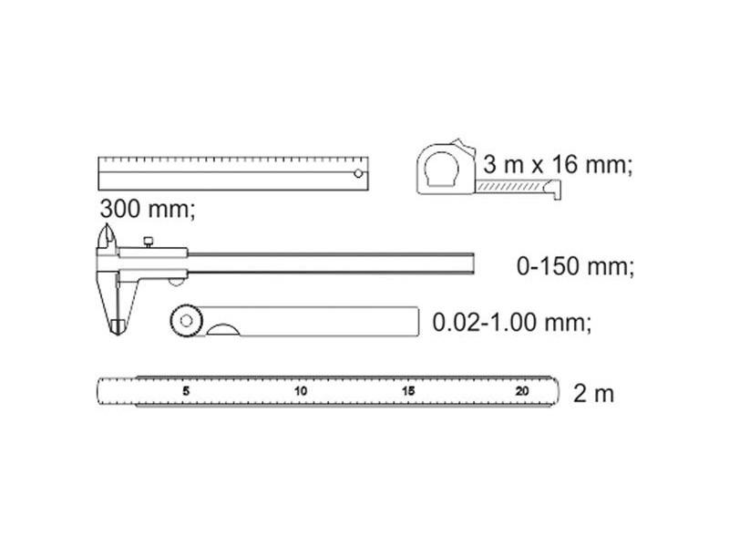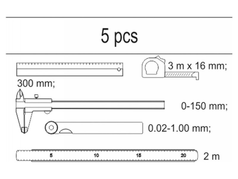 | Set includes | aluminum ruler (300 mm), caliper (0-150 mm), foldable tape measure (2 m), measuring tape (3 m x 16 mm), feeler gauge (0.02-1 mm) |