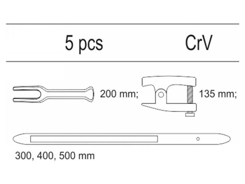 | Set includes | steering rack puller (200 mm), ball pin extractor (135 mm), tire lever x3 (300 mm, 400 mm, 500 mm) |