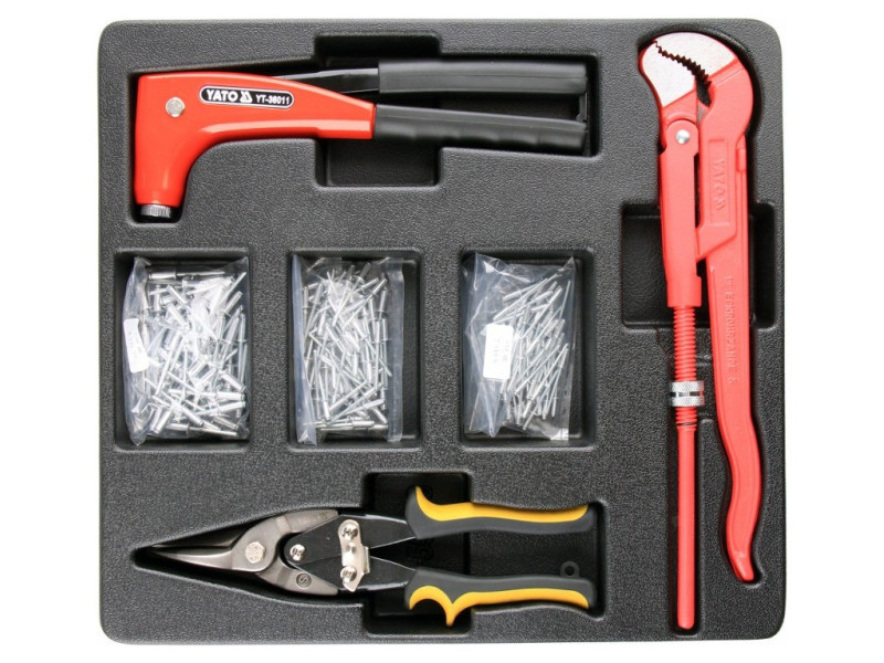 Drawer cartridge containing a riveter, rivets, sheet metal scissors and an adjustable key. - insert - riveter with a rotating head YT -36011 - sets of teetiff rivets 9.6x3.2, 9.6x4.0, 12.7x4.8 mm - key to pipe type Swedish type YT -2216 - sheet sheet sheet cutter