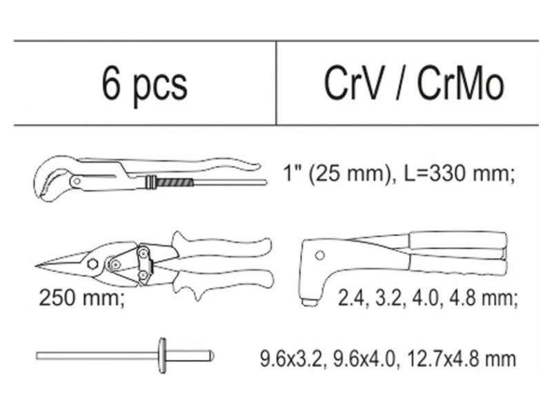 | Set includes | adjustable pipe wrench (1" / 25 mm), sheet metal shears (250 mm), flat cutter x3 (10x142 mm, 12x152 mm, 16x172 mm), hand riveter (Ø2.4 mm, Ø3.2 mm, Ø4 mm, Ø4.8 mm), |
