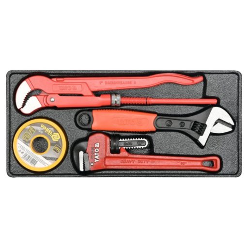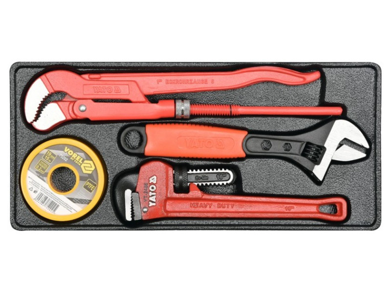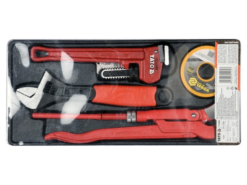 A set of tools for plumbing. The kit includes: - key to S 1 "YT -2216 - key to 10" YT -2488 pipes - 250mm YT -2172 adjustment key - PTFE tape 15m x 190mm for sealing threads 75202 The set is packed on a tray of 38 , 5 x 17.5 x 4.1cm, which fits both prams and tool boxes Yato YT-09101 / YT-09102 / YT-09107 / YT-09108 and for service cabinets. Hydraulics