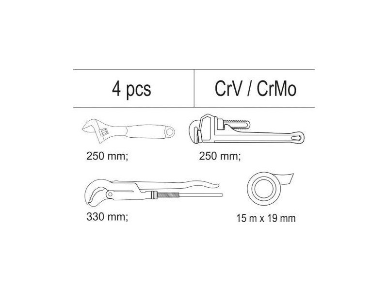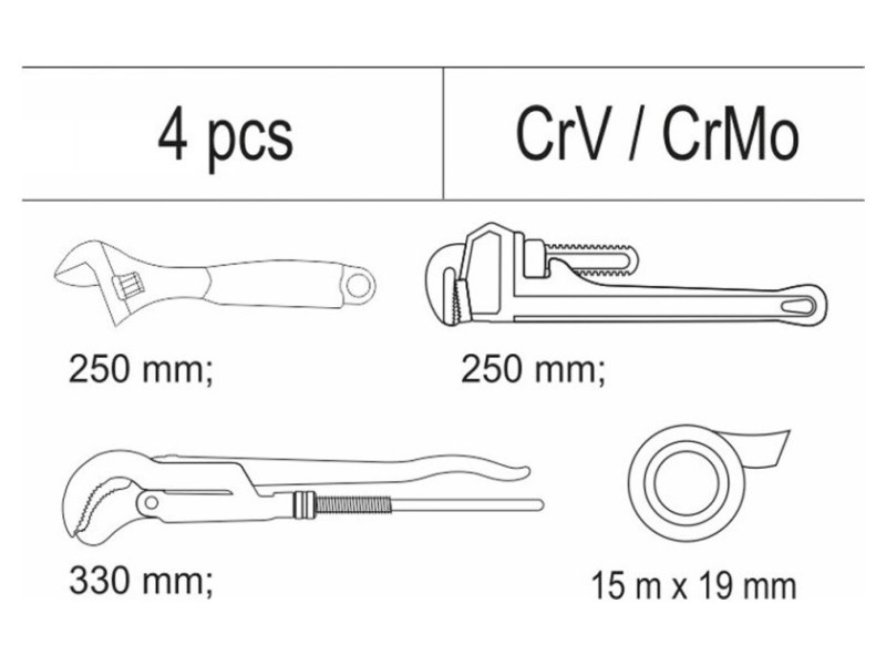 | Set includes | adjustable wrench (250 mm), S-type pipe wrench (1" / 25 mm), pipe wrench (10" / 250 mm), PTFE tape for thread sealing (15 m x 19 mm)More |