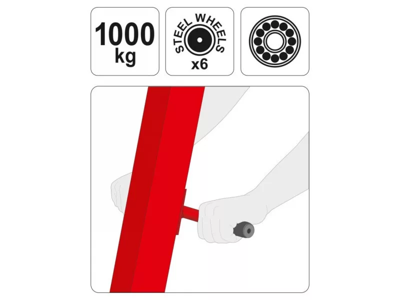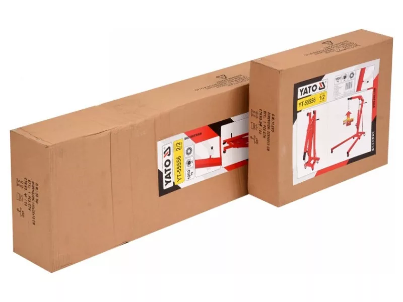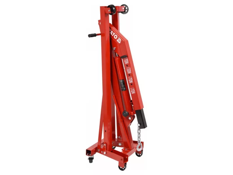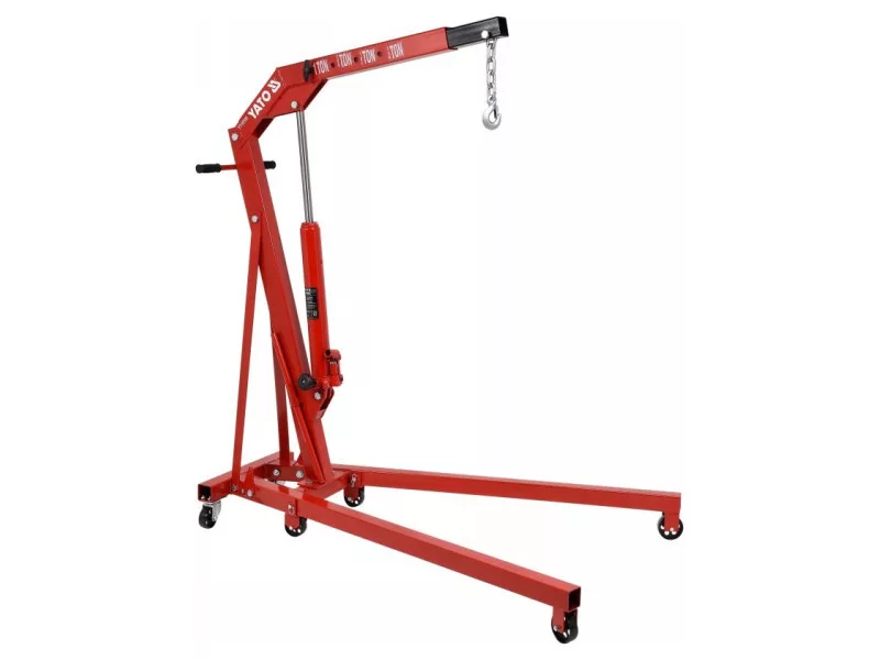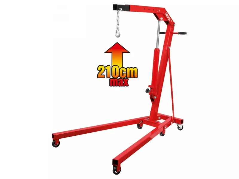 Professional workshop crane with a load capacity of up to 1000 kg. It has a precise trigger valveór for easy positioning of the suspended workpiece. It has a compact fully collapsible design. Dimensions of the product when folded: height 152cm, width 48cm, depth to boom 54cm. It is equipped with 6 metal kół - and a special handle for easy maneuvering. The total lifting height is as high as 210cm. The 1000kg workshop crane has all the required certificates allowing it to work in automotive workshops and manufacturing plants.