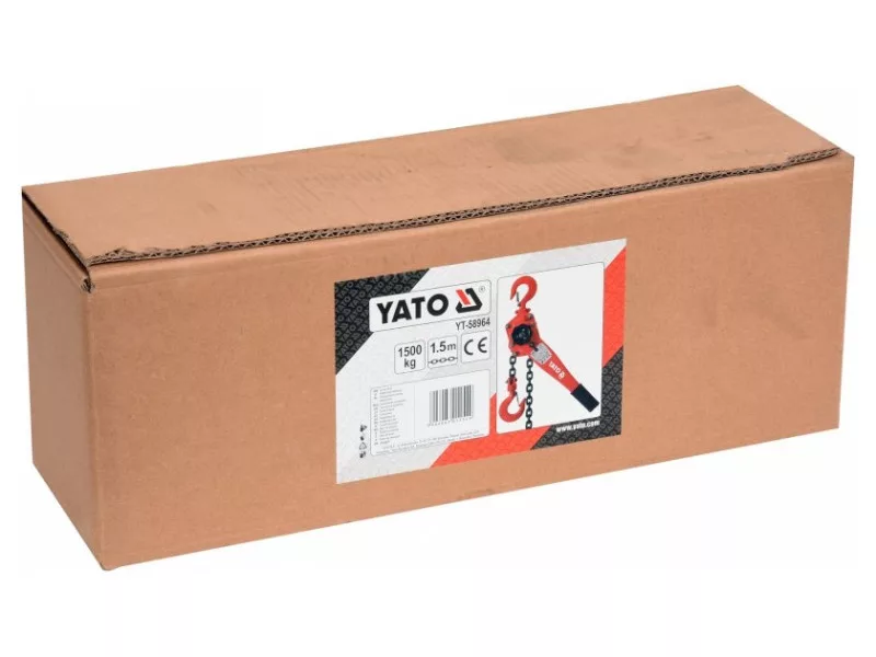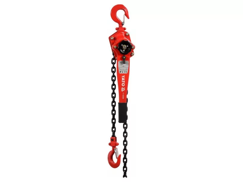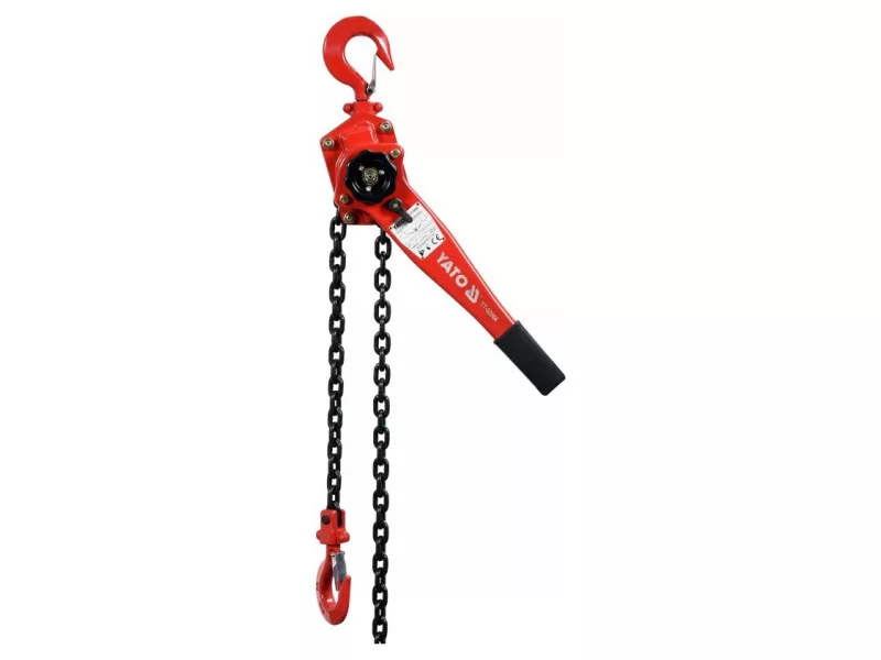 NEW LINE OF YATO CHAIN LEVERLOCKS Yato chain lever hoists , are designed for intensive use in industrial conditions in manufacturing companies, transport companies, shipyards, mines and warehouses. They allow lifting heavy loads, structural elements , foundation of machines as well as pre-tensioning of ropes and effective securing of heavy loads . The hoists are equipped with hooks of special design to increase the safety of work. The lifting height is 1500 mm .The new line of hoists is distinguished by a compact damage-resistant all-steel, corrosion-protected design . Precise lever mechanism, minimizes the force required to lift loads.The full product line includes lever hoists with lifting capacity from 750 kg - 9 tons ... Detailed data available in the technical documentation of the equipment. Hoists are covered by service during and after the warranty. Manual hoists with a lifting capacity of more than 2,000 kg are subject to notification and stationary acceptance by the Office of Technical Inspection. For lifting heavy loads, tensioning , setting. Before using, please read the instruction manual.