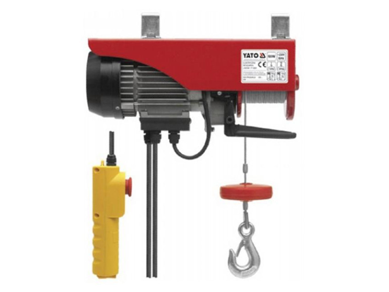 Application: construction industry, contractors. The winch is used to pull the load in the vertical axis to great heights. Construction: carrying element: braided steel cable, drive is an electric motor, slow-motion gearbox, electro-mechanical brake blocking the gearbox when the power supply to the motor is disconnected, control console on a long electric cable, mechanical limit switch. YATO Premium For pulling small loads during construction work.
