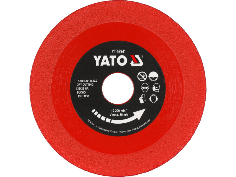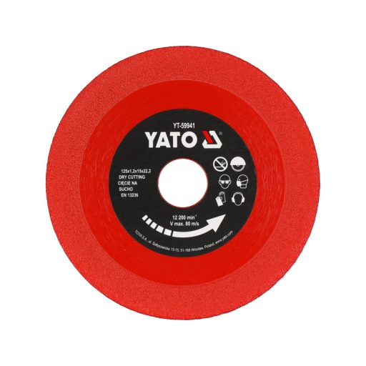 Diamond blade for dry cutting of glass, ceramic, stoneware and terracotta. It is perfect for professional applications and creative work with glass. Made using vacuum-soldered diamond technology. It is used for precision cutting, edge grinding and chamfering of tiles. The design of the blade ensures even working without lateral run-out, resulting in a high-quality, splinter-free cut. The surface of the disc is coated with an anti-corrosion paint, which increases its durability. Fits Angle grinders (such as: YT-82101, YT-821024, YT-82097, YT-828293) and tile cutters (such as: YT-82159, YT-821591).